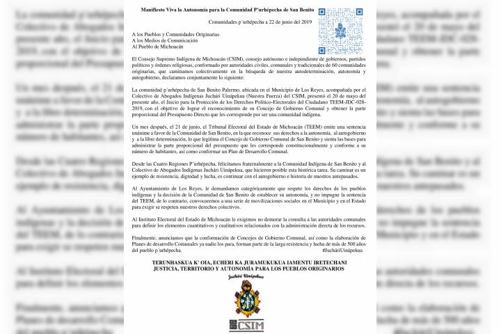 NOTICIAS 22/06/2019Comunidad p´urhépecha de San Benito, Municipio de Los Reyes obtiene el Presupuesto Directo. A través de un comunicado, el Consejo Supremo Indígena de Michoacán (CSIM), consejo conformado por autoridades civiles, comunales y tradicionales de 60 comunidades originarias, felicitaron a la comunidad p´urhépecha de San Benito, ubicada en el municipio Los Reyes, por lograr el reconocimiento de sus derechos de libre determinación, autogobierno y autonomía y obtener el presupuesto directo, lo anterior mediante la sentencia del Juicio para... Ver más...