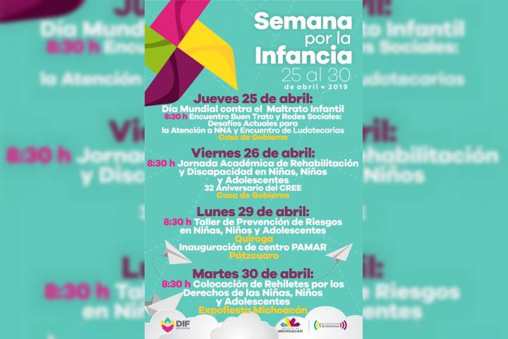 NOTICIAS 17/04/2019Invita DIF Michoacán a conmemorar el Día del Niño En el marco de los festejos del Día del Niño, el Sistema estatal para el Desarrollo Integral de la Familia, DIF Michoacán, realizará la Semana por la Infancia, con diversas actividades encaminadas a fortalecer la protección de sus derechos y la inclusión de niñas y niños con discapacidad, en un ambiente divertido, cercano y lleno de aprendizaje.