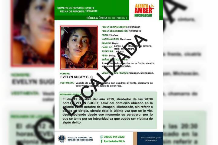Una adolescente de 13 años de edad que fue reportada como desaparecida en la ciudad de Uruapan, fue localizada, sana y salva, por personal de la Fiscalía Regional, durante tareas de investigación llevadas a cabo con motivo de la implementación del mecanismo de búsqueda Alerta Amber.
