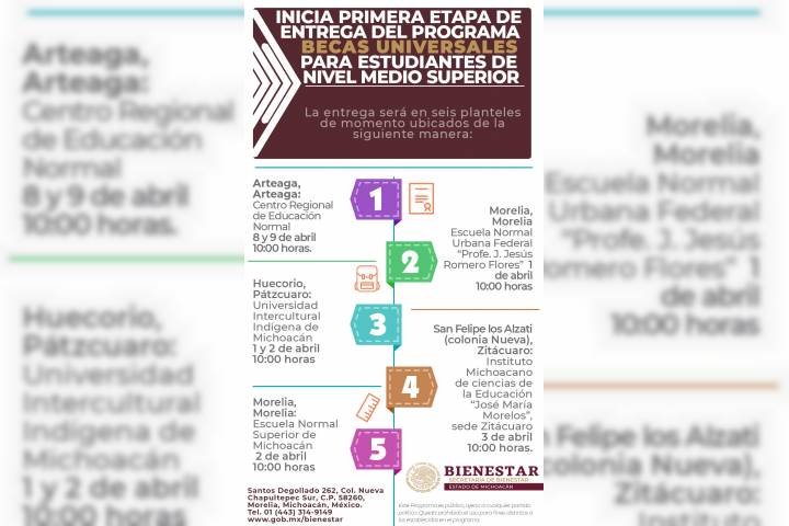 NOTICIAS 04/04/2019Continúa primera etapa de entrega de Becas Benito Juárez en MichoacánLa SecretarÃa de Bienestar en Michoacán inicia con la primera etapa de entregas en el estado del Programa Becas Universales para Estudiantes de Nivel Medio Superior.