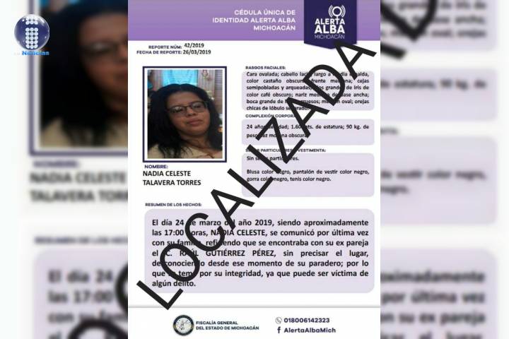 A través de la FiscalÃa Especializada para la Investigación y Persecución de los Delitos de Desaparición Forzada de Personas y Desaparición Cometida por Particulares, se logró encontrar, sana y salva, a Nadia Celeste T., de 24 años de edad.