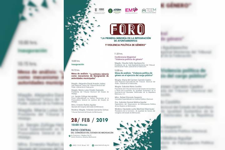 Dentro de las actividades de capacitación en materia electoral para este año, el Tribunal Electoral del Estado de Michoacán, el Congreso de Michoacán, el Instituto Electoral de Michoacán y la Asociación de Tribunales Electorales de la República Mexicana, realizarán el Foro "la Primera Minoría en la Integración de los Ayuntamientos y Violencia Política de Género" el próximo jueves 28 de Febrero en la sede del Congreso del Estado.