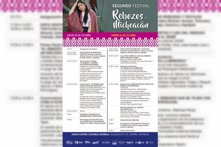 NOTICIAS 19/10/2018Realizan el "Segundo Festival Rebozos de Michoacán" Con la finalidad de brindar un espacio de sensibilización en donde el público asistente pueda conocer más de cerca parte del patrimonio cultural de Michoacán, los pueblos y localidades donde se elaboran rebozos, se realiza el "Segundo Festival Rebozos de Michoacán", los días 25 y 26 de Octubre del presente año en la UNAM Centro Cultural Morelia.