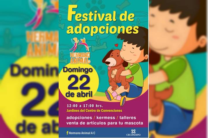 NOTICIAS 20/04/2018Este domingo Feria de Adopción canina en Ceconexpo Con el objetivo de fomentar la cultura de adopción de mascotas y el fomento del respeto a los derechos de los animales la asociación civil Hermano Animal te invita a que asistas al Festival de Adopciones que se realizará este domingo 22 de abril en los jardines del Centro de Convenciones de Morelia (CECONEXPO) de las 12 a las 17 horas.
