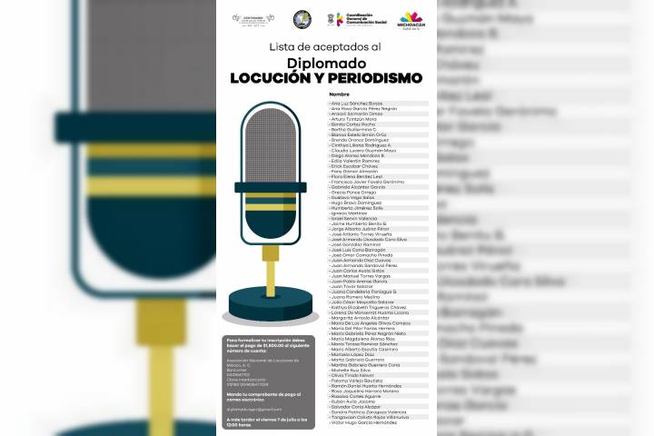 NOTICIAS 05/07/2017Arranca el viernes Diplomado en "Locución y Periodismo" Con la participación de periodistas y comunicadores de distintas regiones de Michoacán, el próximo viernes será inaugurado el Diplomado "Locución y Periodismo" que será impartido por ponentes especializados de la Asociación Nacional de Locutores de México A.C., en acuerdo con el Gobierno del Estado, a través de la Coordinación General de Comunicación Social (CGCS).