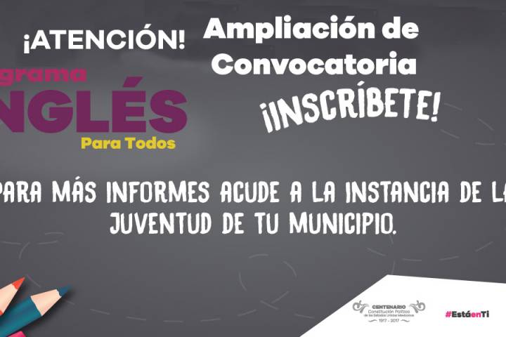 NOTICIAS 25/04/2017Amplían la convocatoria del programa "Inglés para todos en Michoacán"El Instituto de la Juventud Michoacana (Ijumich) y el Programa Nacional Inglés Para Todos En México, anunciaron la ampliación de la convocatoria hasta el 16 de mayo para recepción de solicitudes y documentación.