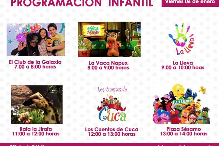 Este viernes 6 de enero, desde las 7:00 hasta las 15:00 horas, las niñas y niños podrán disfrutar de programas como: El Club de la Galaxia, La Vaca Napux, La Lleva, Rafa la Jirafa, Los Cuentos de Cuca y Plaza Sésamo.