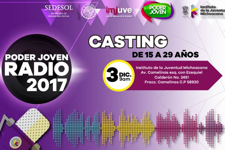 NOTICIAS 18/11/2016Convocan a jóvenes a participar en programa de radio Los institutos de la Juventud Michoacana (IJUMICH) y Mexicano de la Juventud (IMJUVE) invitan a las y los jóvenes de entre 15 y 29 años a participar en el proceso de selección para formar parte de la Red Nacional Poder Joven Radio y TV 2016, programa mediante el cual las y los beneficiarios colaborarán en emisiones radiofónicas durante un año.