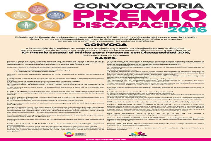 NOTICIAS 02/11/2016Abierta la convocatoria al 10° Premio Estatal al Mérito para Personas con discapacidad 2016El Gobierno del Estado de Michoacán a través del Sistema para el Desarrollo Integral de la Familia (DIF) Michoacán y el Consejo Michoacano para la Inclusión de las Personas con Discapacidad invitan a participar en el 10° Premio Estatal al Mérito para Personas con Discapacidad 2016.
