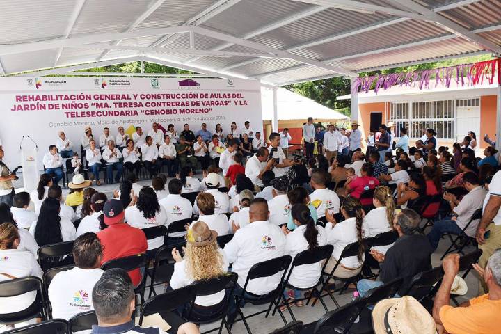 NOTICIAS 20/10/2016Destaca Sepsol avances en Cenobio MorenoGracias al esfuerzo conjunto de los tres órdenes de gobierno y al trabajo transversal de la administración estatal, avanza la reconstrucción del tejido social en Cenobio Moreno, municipio de Apatzingán, afirmó Miriam Tinoco Soto, titular de la Secretaria de Política Social (Sepsol), al dar a conocer que el programa Beca Futuro tiene cobertura total en la comunidad, donde se entregaron tres aulas tanto para el Jardín de Niños y la telesecu... Ver más...