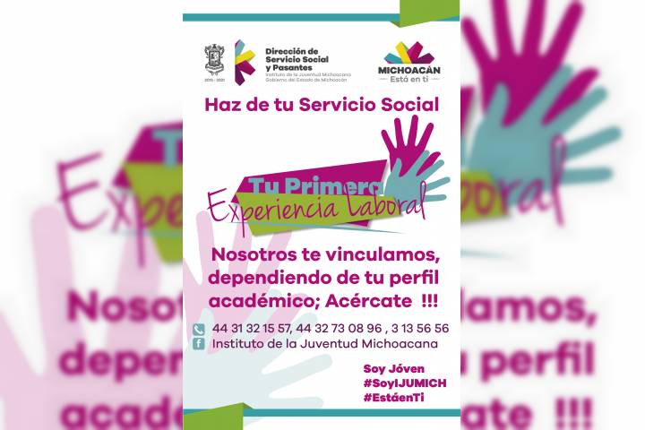 El instituto de la juventud Michoacana (IJUMICH) abre sus puertas a través de la dirección del Servicio Social y Pasantes a los estudiantes o egresados de las carreras de nivel Medio Superior o Superior, de las Instituciones Públicas o Privadas, para formar parte del programa "Tu primera experiencia laboral".