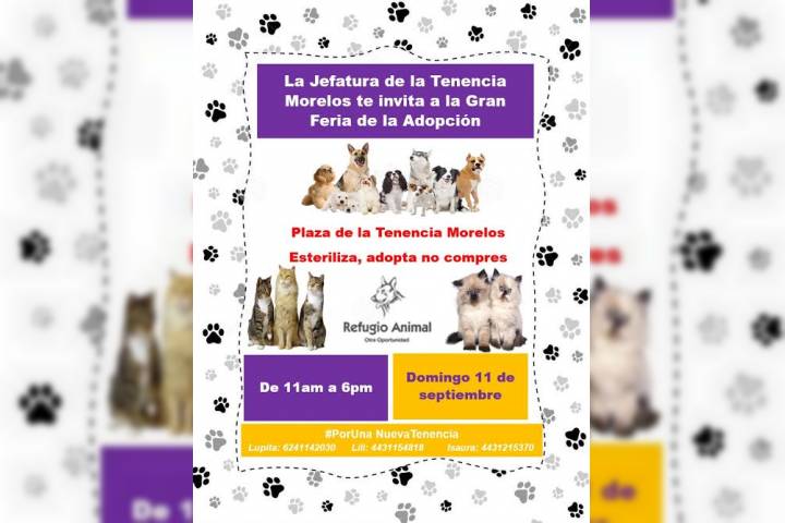 NOTICIAS 10/09/2016Feria de Adopción Canina en la Tenencia MorelosLa jefatura de la Tenencia Morelos, a cargo de Víctor Montelongo Reyes, se une a la cultura de la adopción de mascotas y este domingo 11 de septiembre, de las 11 a las 18 horas, realizará, conjuntamente con animalistas independientes, una Feria de Adopción, la cual tendrá como sede la plaza principal de esa histórica comunidad.
