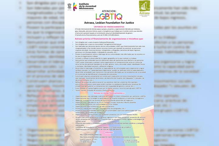 NOTICIAS 22/06/2016Destaca IJUMICH financiamientos a organizaciones de la comunidad LGBTTTI En el marco del Día Internacional de la Comunidad Lésbico, Gay, Bisexual, Travesti, Transexual, Transgénero e Intersexual (LGBTTTI), el Instituto de la Juventud Michoacana (IJUMICH) invitó a grupos, proyectos y organizaciones que trabajan por el cambio social y que abordan el tema de la discriminación basada en la orientación sexual y/o identidad/expresión de género a participar en la convocatoria del Fondo Internacional de la fundación ... Ver más...