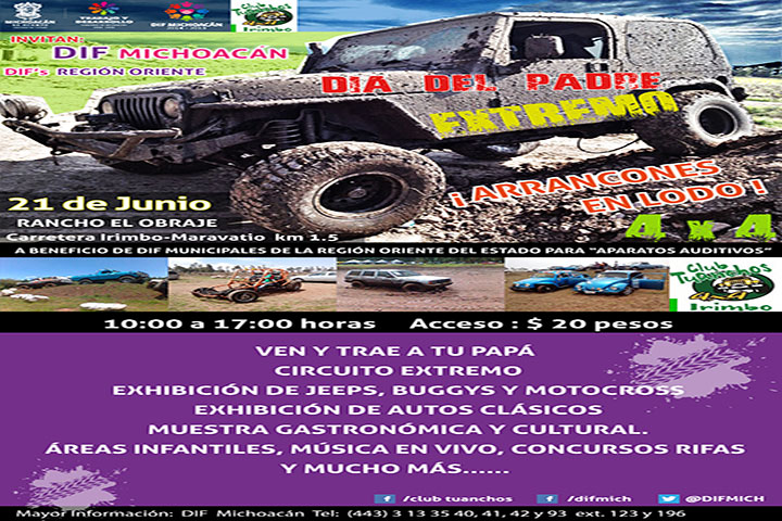 NOTICIAS 16/06/2015Anuncian el "Día del Padre Extremo"Autoridades del Sistema DIF estatal en conjunto con las autoridades municipales de Irimbo, dieron a conocer lo que será el evento "Día del Padre Extremo" el cual se realizará el próximo 21 de junio en el marco del Día del padre.