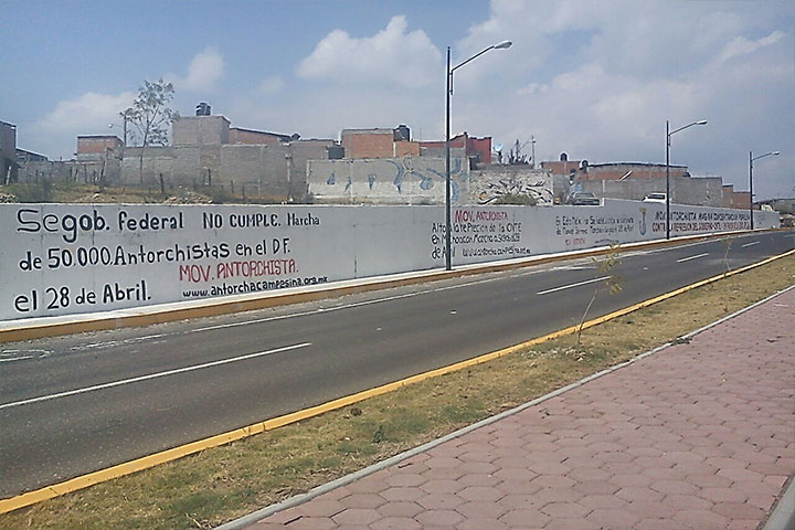 Decenas de pintas han aparecido en territorio michoacano denunciando que la Secretaría de Gobernación federal no cumple los compromisos contraídos con los representantes populares, siendo ello causa de la marcha de protesta que se realizará a Los Pinos el martes 28 de abril, "y vamos a seguir haciendo uso de esta forma de denuncia pública, sin afectar la propiedad privada, y hasta donde sea posible legalmente", explicó el vocero del Movim... Ver más...