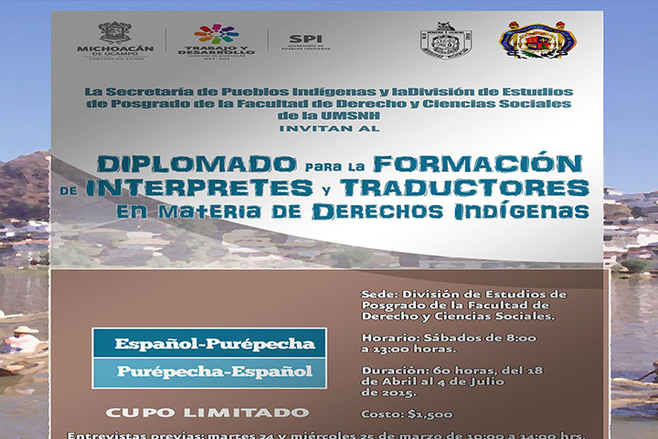 Ante la entrada en vigencia del Nuevo Sistema de Justicia Penal, la Secretaría de Pueblos Indígenas (SPI) en coordinación con la División de Estudios de Posgrado de la Facultad de Derecho, de la Universidad Michoacana de San Nicolás de Hidalgo (UMSNH), organizaron un diplomado para la formación de intérpretes y traductores en materia de derechos indígenas.