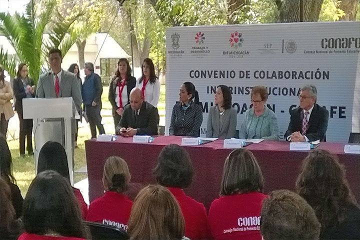 Consolidan firma de Convenio de Colaboración Interinstitucional entre el DIF Estatal y el Consejo Nacional de Fomento Educativo (CONAFE) para otorgar más de 600 despensas a familias que reciben a promotores educativos en comunidades alejadas del estado de Michoacán.