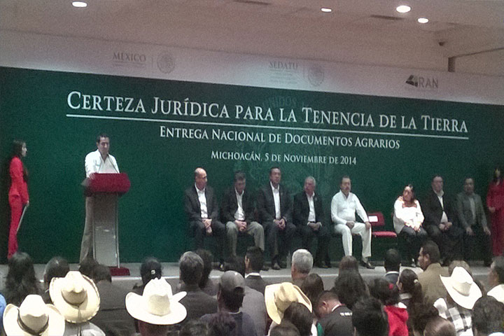 NOTICIAS 05/11/2014Sedatu entrega títulos de propiedadLa Secretaría de Desarrollo Agrario Territorial y Urbano (SEDATU) mediante su delegación entregó en el estado de Michoacán 504 títulos de propiedad a escuelas o espacios públicos, 19 al Sector Salud, 13 de Prospera IMSS y mil certificados parcelario en ejidos y comunidades, dentro del programa "Certeza Jurídica para la Tenencia de la Tierra".