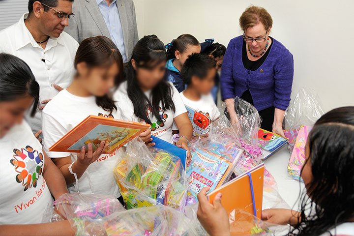NOTICIAS 06/11/2014DIF recibe acervo de libros para Casa Hogar "Vivan los Niños"La presidenta del Sistema para el Desarrollo Integral de la Familia (DIF) Michoacán, Catherine R. Ettinger y Mariana Sosa Olmeda, directora de la institución, recibieron un acervo de 2 mil libros del Instituto Educativo Varmond School, para la biblioteca de la Casa Hogar "Vivan los Niños".