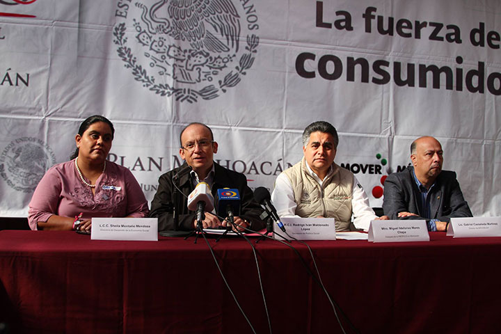 En rueda de prensa, el secretario de Política Social (Sepsol), Rodrigo Maldonado López, y el delegado de la Profeco en Michoacán, Miguel ... Ver más...
