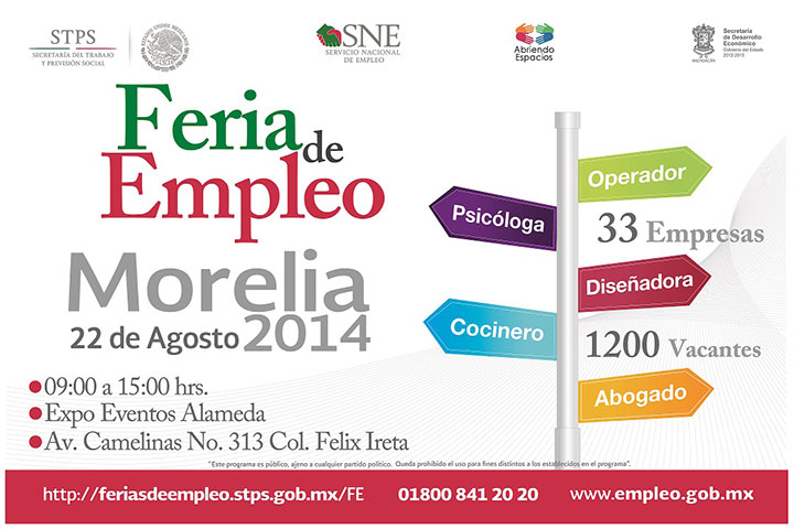 El Servicio Nacional de Empleo (SNE) en Michoacán llevará a cabo este viernes 22 de agosto su vigésima Feria de Empleo en lo que va del año, esta vez en la capital del estado, donde se estarán ofertando mil 200 vacantes.