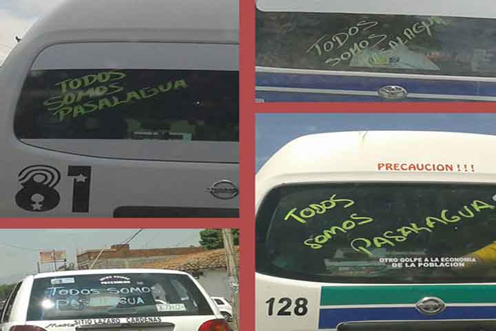 Ante la detención, para dar cumplimiento a una orden de presentación en la PGR, del Ex diputado del PRI y líder transportista, José Trinidad Martínez Pasalagua, transportistas en el municipio de Pátzcuaro de líneas de combis y taxis filiales al PRI han colocado leyendas en sus unidades que dicen "todos somos Pasalagua".
