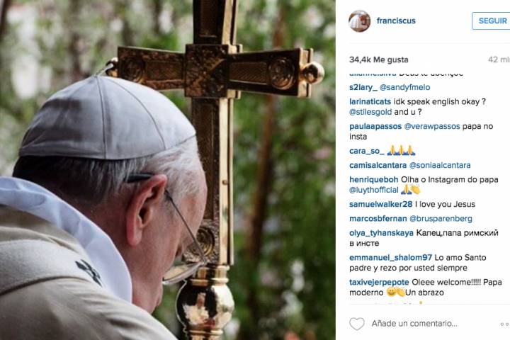 NOTICIAS 19/03/2016Papa Francisco publica primeras imágenes en Instagram El papa Francisco abrió hoy su cuenta oficial en la red social de Instagram y lo hizo con el nombre de "Franciscus", una fotografÃa suya, de rodillas, rezando, y con un mensaje: "Rezad por mÃ", escrito en nueve idiomas.