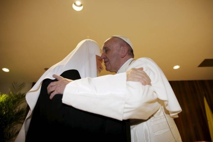 NOTICIAS 12/02/2016Papa Francisco y Patriarca Cirilo I se dan histórico abrazo El Papa Francisco y el patriarca ortodoxo de Moscú, Cirilo I, se dieron hoy un histórico abrazo en la sala presidencial del aeropuerto José Martí de La Habana, en el primer encuentro entre un pontífice romano y un patriarca ruso.