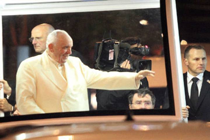 En el camino se pudo apreciar a miles de personas con lámparas y teléfonos celulares prendidos, en señal de bienvenida al máximo jerarca de la Iglesia Católica.