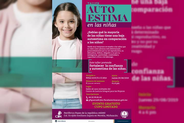 NOTICIAS 26/08/2019Realizará CJIM taller de Autoestima para niñasCon el objetivo de reforzar la salud emocional de las niñas, para un adecuado desarrollo en su autoestima, la FiscalÃa General del Estado de Michoacán (FGE) a través del Centro de Justicia Integral para las Mujeres (CJIM) llevará a cabo el taller denominado "Autoestima en las niñas".