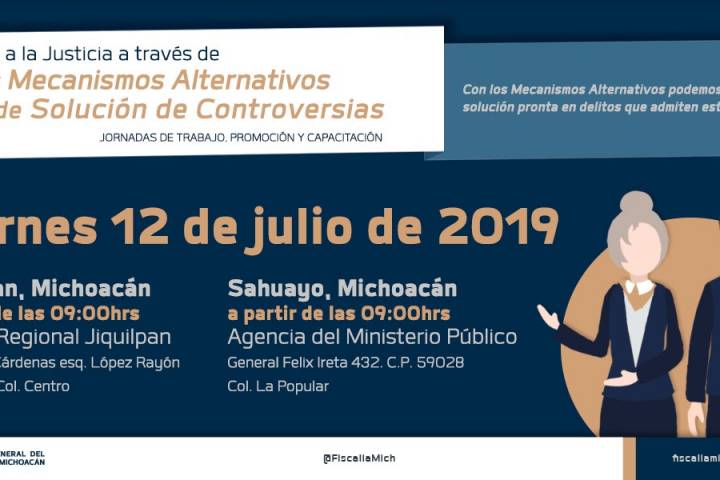 NOTICIAS 03/07/2019Realiza FGE jornada de capacitación y difusión de mecanismos alternativos de acceso a la JusticiaComo parte de los trabajos que lleva a cabo la Fiscalía General del Estado de Michoacán (FGE) para acercar a la ciudadanía alternativas para acceder a la justicia, este día arrancó la jornada de promoción y capacitación "El Acceso a la Justicia a través de los Mecanismos Alternativos de Solución de Controversias".