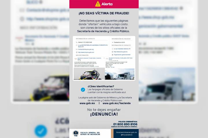 NOTICIAS 12/06/2019Alerta FGE por clones de páginas de internet que "ofertan" vehículos a bajos costoCon el objetivo de evitar que las y los michoacanos sean víctimas de actos delictivos y salvaguardar su integridad y su patrimonio, la Fiscalía General del Estado de Michoacán (FGE) exhorta a la población a extremar precauciones al momento de acceder a productos y servicios que se ofertan en internet.