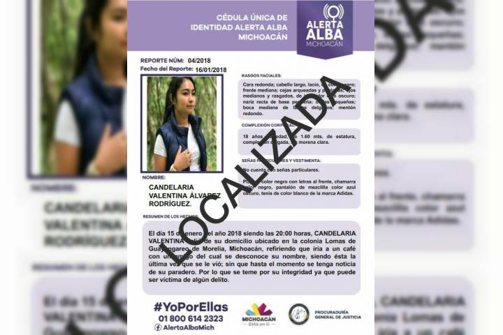 La Procuraduría General de Justicia del Estado (PGJE), a través de la Fiscalía Especializada en Personas Desaparecidas, localizó a una joven de 18 años de edad que fue reportada desaparecida en esta ciudad de Morelia.