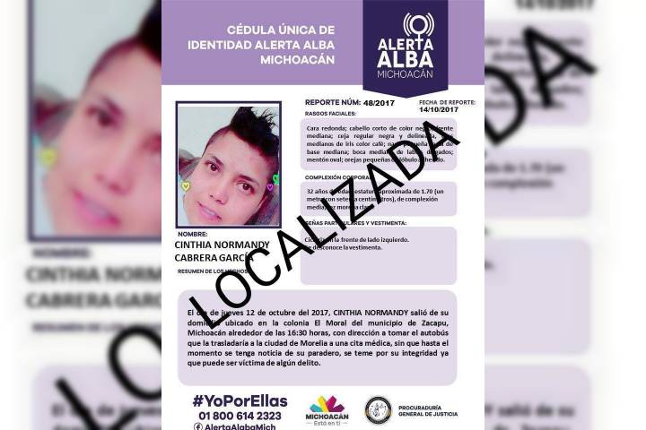La ProcuradurÃa General de Justicia del Estado (PGJE), a través de la FiscalÃa Especializada en Personas Desaparecidas, localizó a una mujer de 32 años de edad que el pasado 12 de octubre fue reportada desaparecida en Zacapu.