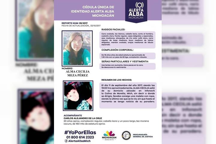 La ProcuradurÃa General de Justicia del Estado (PGJE) informó que desde el pasado 21 de septiembre del presente año, fecha en que se tuvo conocimiento de la desaparición de la joven Alma Cecilia Meza Pérez, emprendió diversos trabajos de investigación y activó el protocolo de búsqueda Alerta Alba Michoacán.
