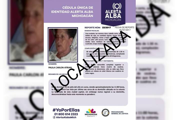 NOTICIAS 27/07/2017Localiza PGJE a sexagenaria reportada desaparecida en MoreliaLa Procuraduría General de Justicia del Estado (PGJE), a través de la Fiscalía Especializada en Personas Desaparecidas, logró localizar a una mujer que fue reportada desaparecida el pasado domingo en una colonia del Poniente de esta ciudad de Morelia.