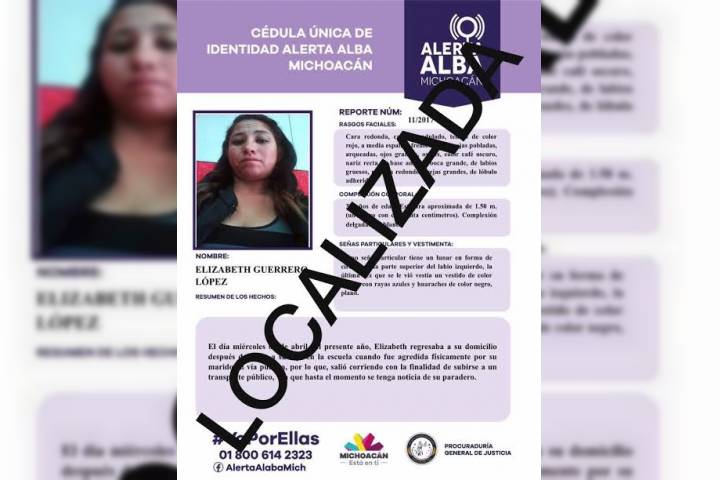 La Procuraduría General de Justicia del Estado (PGJE) de Michoacán, a través de la Fiscalía Especializada en Personas Desaparecidas, logró asegurar a una mujer de 37 años de edad que el pasado día 5 de abril por la tarde fue reportada desaparecida en Morelia.