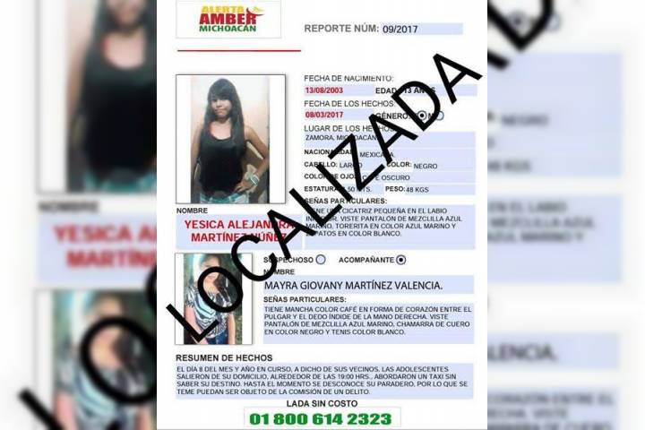 Derivado de un operativo implementado por la Procuraduría General de Justicia del Estado (PGJE) de Michoacán a través de la Fiscalía Especializada en Personas Desparecidas, fueron aseguradas dos menores de edad que estaban desaparecidas desde la semana pasada en esta ciudad de Zamora; ya fue desactivada Alerta Amber.