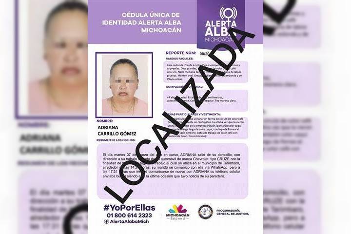 Trabajos de investigación e inteligencia llevados a cabo por la Procuraduría General de Justicia del Estado (PGJE) de Michoacán, a través de la Fiscalía Especializada en Personas Desaparecidas, permitieron localizar a una mujer de 42 años de edad que estaba desaparecida desde el pasado 7 de marzo.