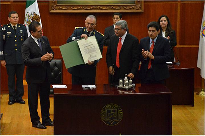 "Valoramos la importante distinción con la que hoy nos honran, reflejo de la confianza que nos depositan los mexicanos y los michoacanos; para quienes integramos la Secretaría de la Defensa Nacional estos reconocimientos nos motivan, nos convocan y nos impulsan para seguir cumpliéndole a la sociedad mexicana sin reservas, sin protagonismos y sin escatimar esfuerzos", señaló el general Salvador Cienfuegos Zepeda, Secretario de la Defensa Na... Ver más...