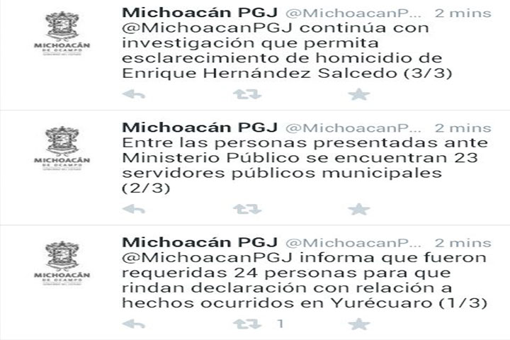 Lo anterior lo dio a conocer la dependencia estatal a través de su cuenta oficial de twitter, @MichoacanPGJ, en la cual i... Ver más...