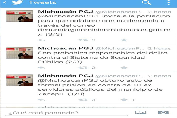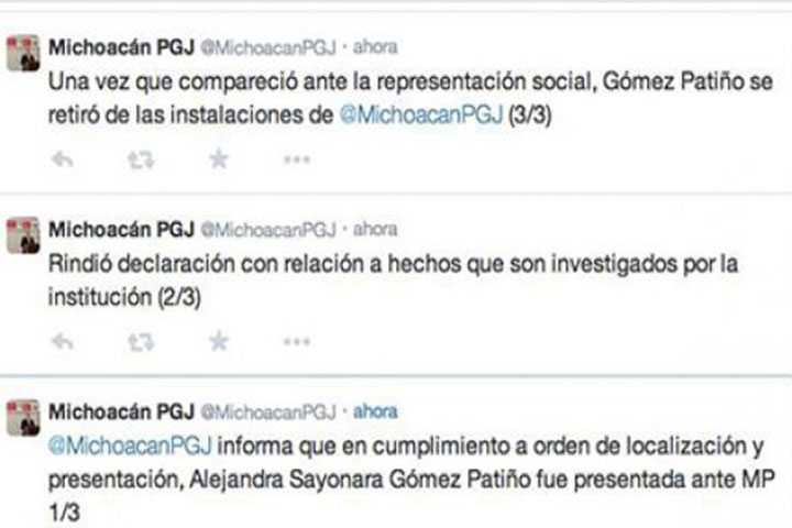 Mediante su cuenta de twitter @MichoacanPGJ, la dependencia estatal detalla que ya rindió declaración con relación a los hech... Ver más...