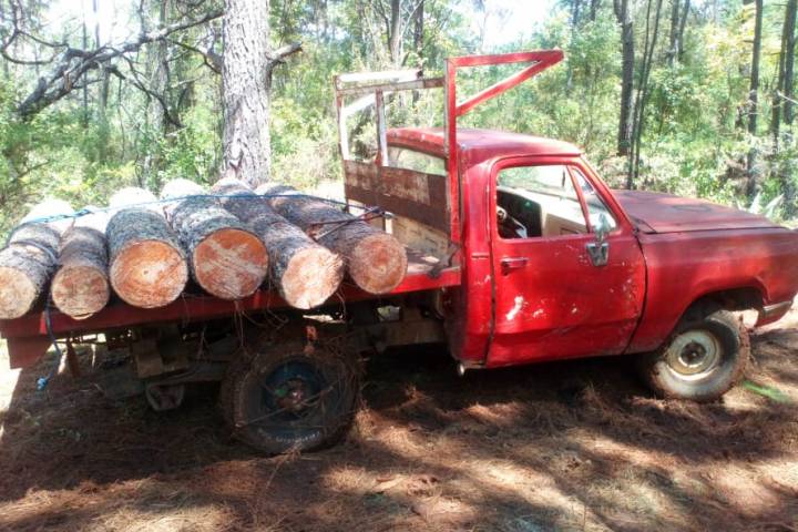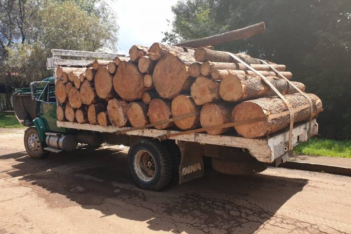 Durante patrullajes de disuasión del delito, agentes de la Policía Michoacán visualizaron un camión estacionado, el cual transportaba decenas de troncos de madera, por lo que procedieron a efectuar una revisión.
