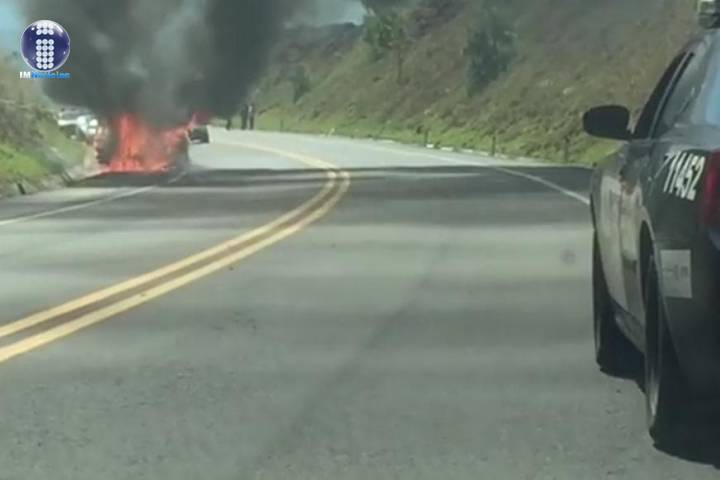 Un vehículo compacto ardió en llamas, por un aparente corto circuito cuando circulaba sobre la autopista Siglo XXI, a unos metros del entronque a la desviación a la entrada a la ciudad de Uruapan, este miércoles.