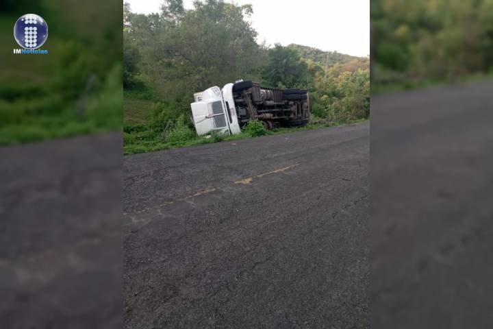 Un tráiler se volcó sobre la carretera federal, Huetamo - Tiquicheo en el kilómetro 153+900, en el lugar conocido como Los Cuitaces, municipio de Tiquicheo.