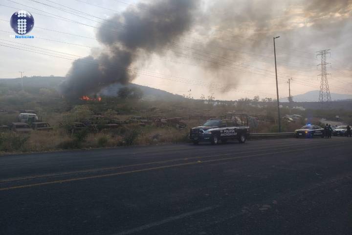 Los agentes de la Policía Michoacán y de la Dirección de Tránsito y Movilidad, llevan a cabo tareas ante el siniestro registrado en la citada zona, donde diversos vehículos se encuentran incendiados.