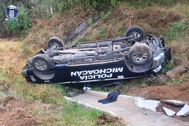 Una patrulla con logotipos de la Policía Michoacán se accidentó en la carretera libre Pátzcuaro-Uruapan, lugar en donde fue abandonada por quien viajaba en ella y posteriormente fue localizada y llevada a un corralón.