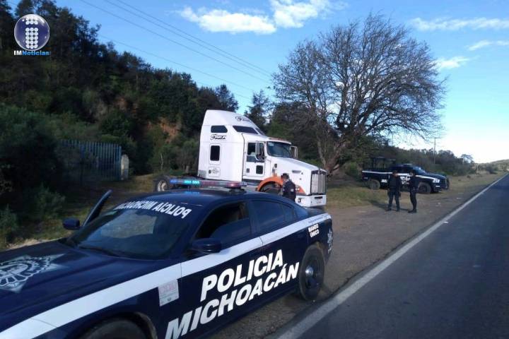 Derivado de un dispositivo de búsqueda, elementos de la Policía Michoacán localizaron el vehículo de la marca Kenworth, a la altura del Kilómetro 54, del tramo carretero Paracho-Capacuaro.