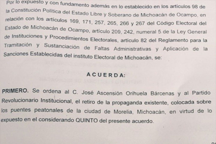 NOTICIAS 12/04/2015Ordena IEM retirar espectaculares de Chon de puentes peatonalesEl Instituto Electoral del Michoacán ordenó a Ascensión Orihuela y al PRI retirar en un plazo de 24 horas los espectaculares colocados ilegalmente en los puentes peatonales y mobiliario urbano de Morelia, por lo cual otorgó la razón a la queja presentada por el Partido de la Revolución Democrática, que señalaba que dicha propaganda era ilegal por contravenir la ley, destacó Carlos Torres Piña.