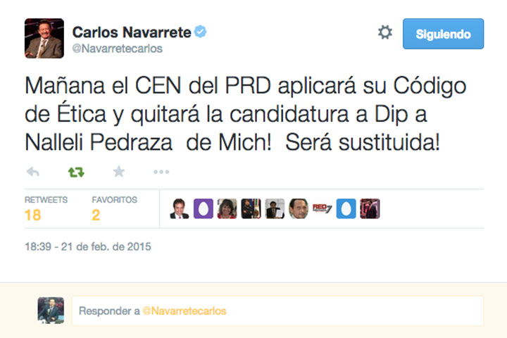 NOTICIAS 21/02/2015No habrá candidatura para la esposa de Arquímides en LázaroCon bombo y platillo festejaban hace menos de 24 horas el grupo de Fidel Calderón la nominación dentro del número dos de la lista de diputados locales pluri-nominales por Michoacán del PRD de la perredista Nayeli Pedraza.